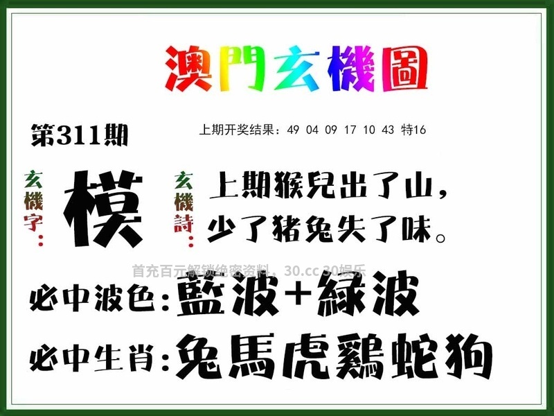| 311期七肖 | 龙猴狗牛鼠虎羊 | 开:發00中 |